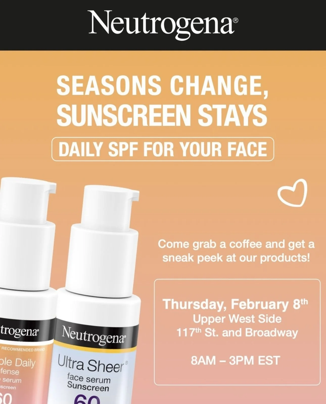 Neutrogena will be in Morningside Heights on Thursday, February 8th to raise awareness about the importance of daily sun protection (even during Winter!)