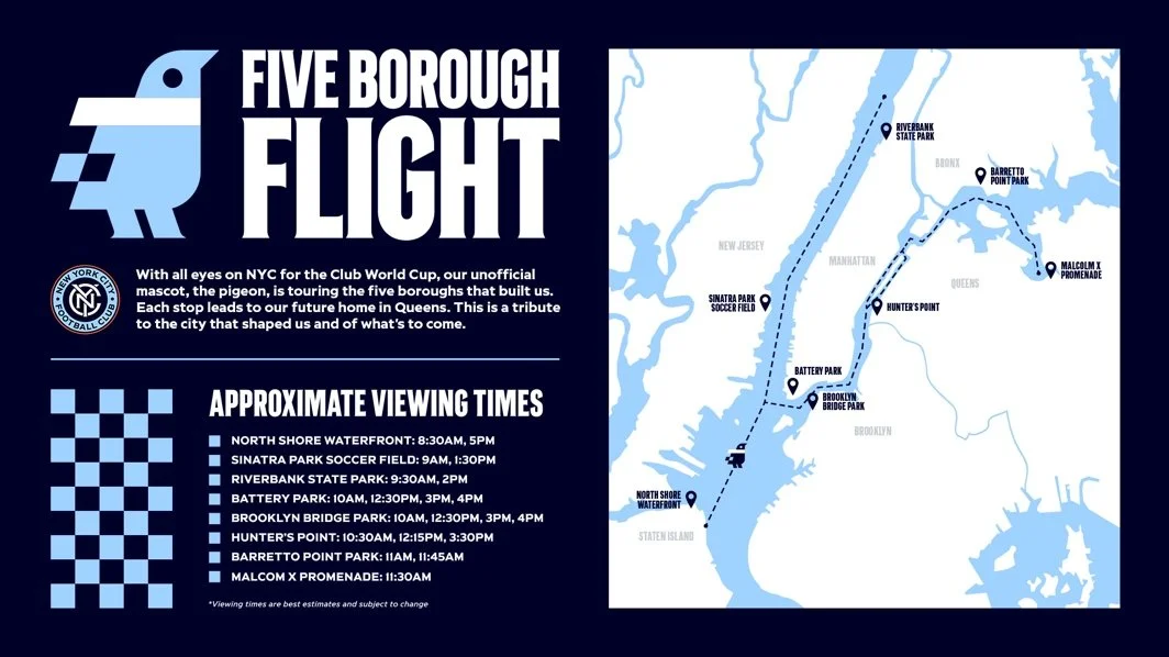 Timed to coincide with the FIFA Club World Cup taking place across the river in New Jersey, the installation – a.k.a. “The Five Borough Flight” – is New York City FC’s way of proudly repping the city and reminding fans of the home club in their backyard. The 700lb pigeon, a nod to New York’s most prolific resident and the Club’s unofficial mascot, was designed to stop soccer fans in their tracks during a peak moment for the sport and kick start the future of NYC football.