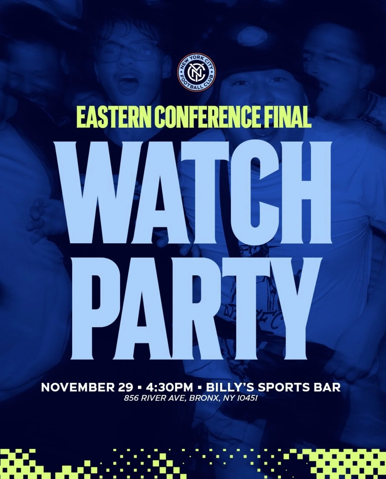 New York City FC will host an official fan watch party at Billy’s Sports Bar across from Yankee Stadium (856 River Ave, Bronx, NY 10451)