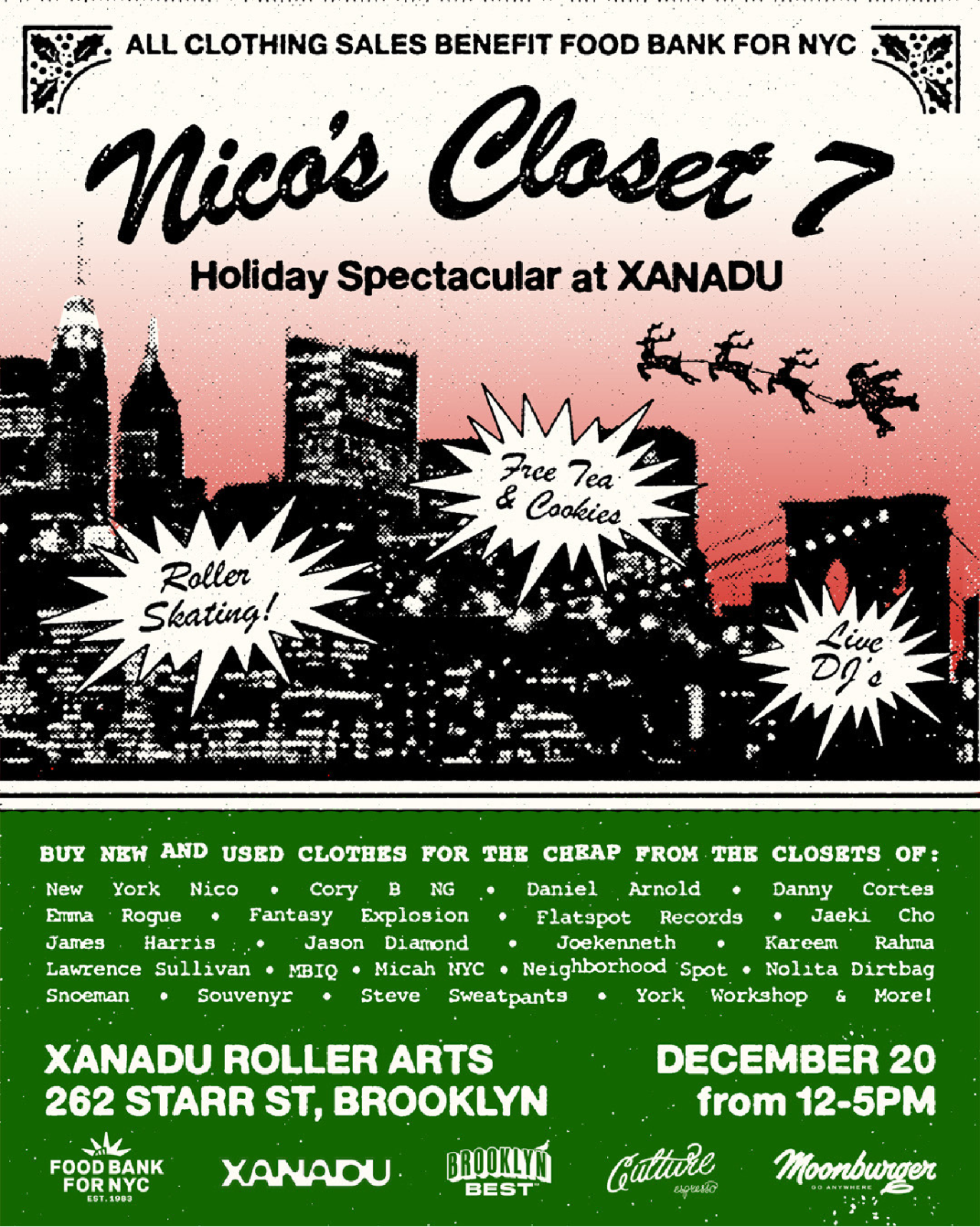 Clothing from the closets of: New York Nico, Cory B NG, Daniel Arnold, Danny Cortes, Emma Rogue, Fantasy Explosion, Flatspot Records, Jaeki Cho, James Harris, Jason Diamond, Joekenneth, Kareem Rahma, Lawrence Sullivan, Micah NYC, Neighborhood Spot, Nolita Dirtbag, Snoeman, Souvenyr, Steve Sweatpants, York Workshop and many more