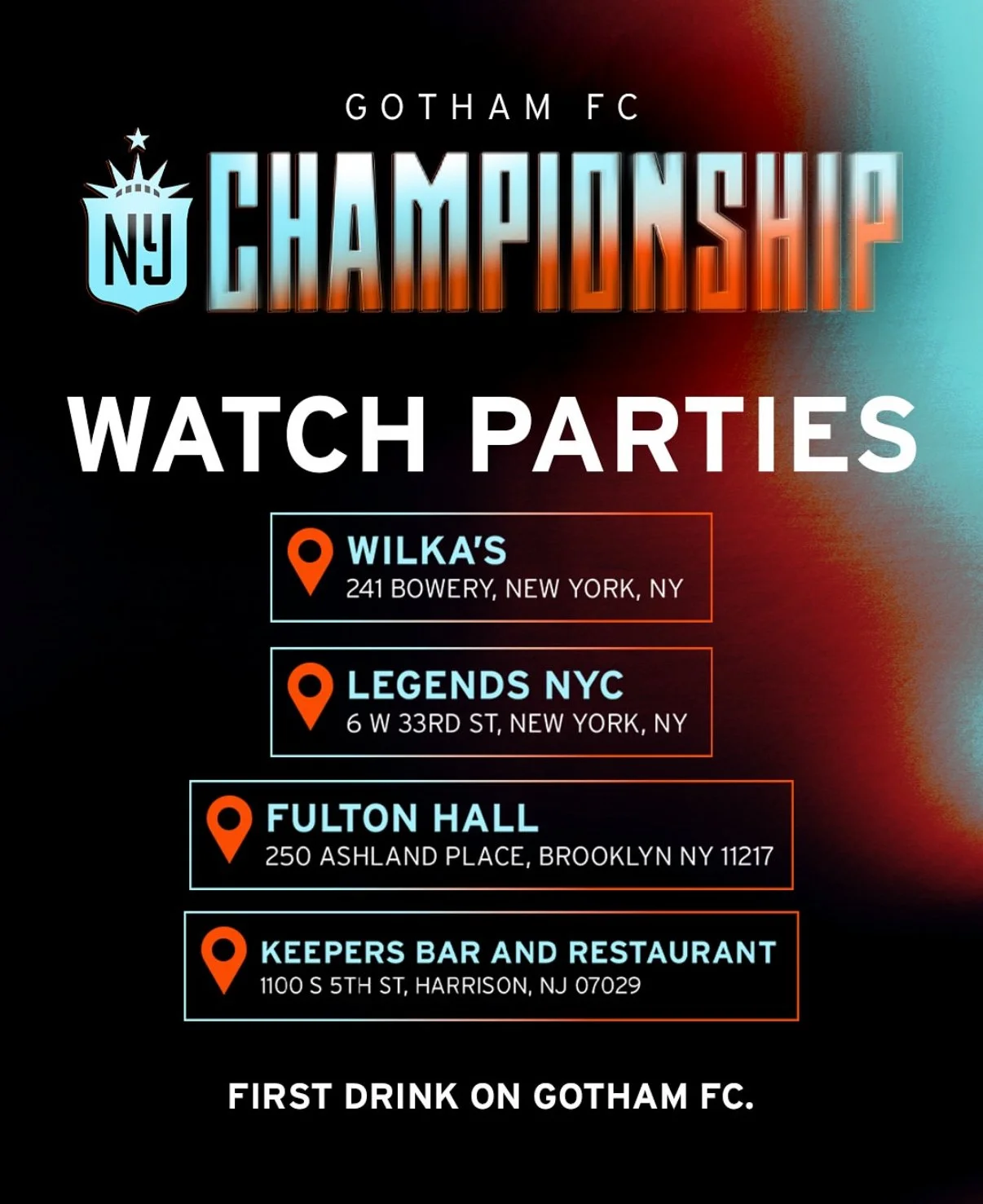 Head over to the following bars on 11/22 to watch Gotham FC take on Washington Spirit for the NWSL Championship. Let’s go Gotham!!