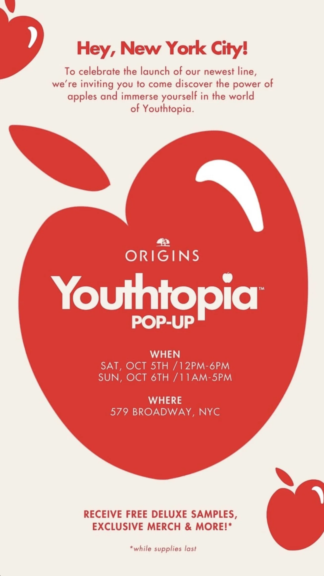 Hey, New York City! To celebrate the launch of Origins newest line, they are inviting you to come discover the power of apples and immerse yourself in the world of Youthtopia.