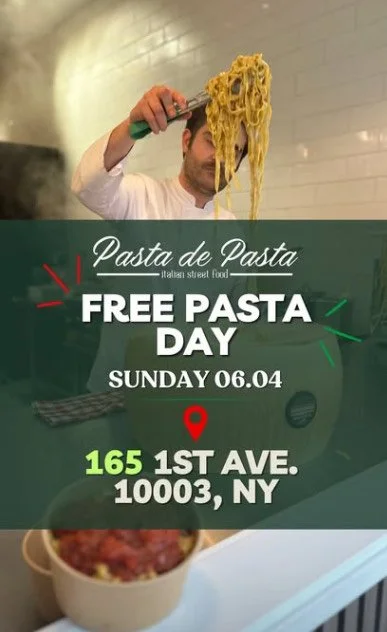 They will be serving free pasta from 12pm til close (or while supplies last) at 165 1st Avenue
