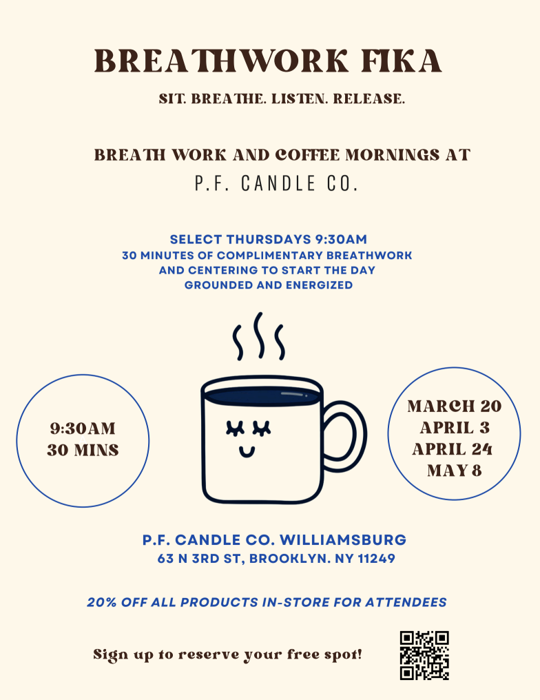 Join for 30 minutes of complimentary breathwork, centering and coffee at PF Candle Co in Williamsburg. Select Thursdays at 9:30a