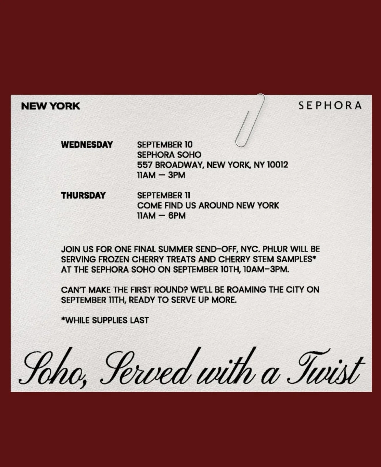 Join Phlur for one final summer send-off! Phlur will be serving frozen cherry treats and Cherry Stem samples (while supplies last) at Sephora Soho on September 10 from 11AM-3PM.