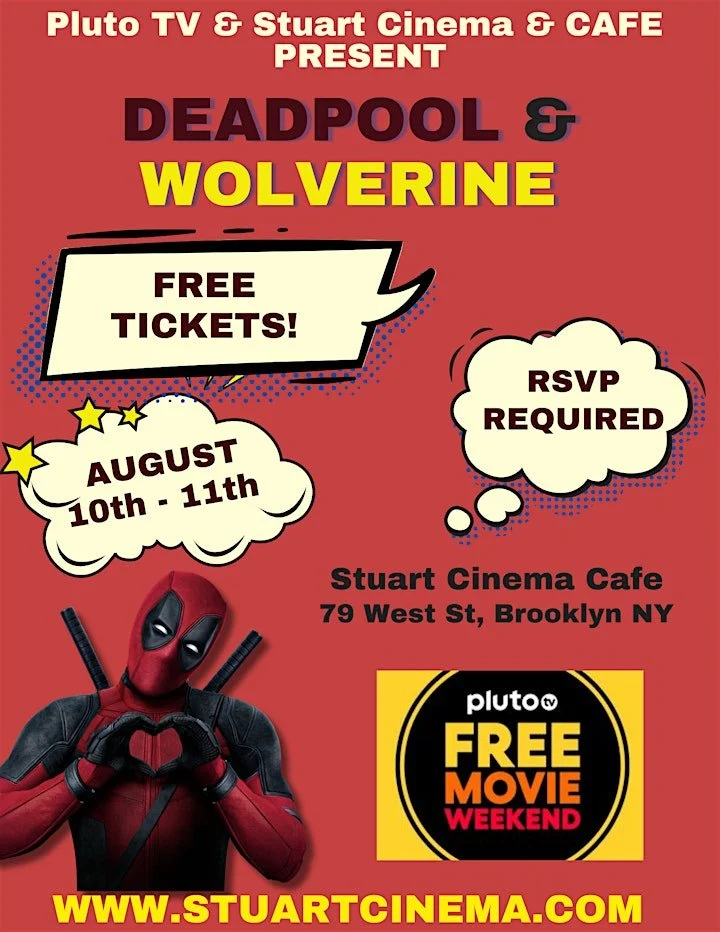 Over the past 3 years, Pluto TV has lent support to select independent movie theaters, hosting free movie weekends each summer. On August 10th and 11th the PlutoTV “Summer of Cinema” comes to Stuart Cinema & Cafe with FREE admission to Deadpool & Wolverine.