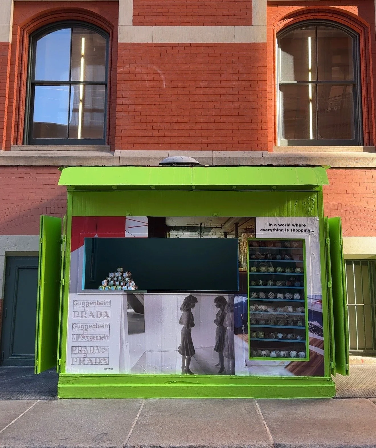 Prada is handing out Red Delicious apples at the little shack outside the Prada SoHo store.