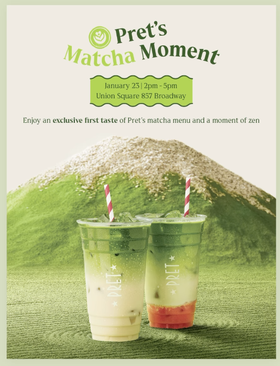 Join Pret at its Union Square shop on January 23rd for an exclusive first taste of their delicious new matcha.