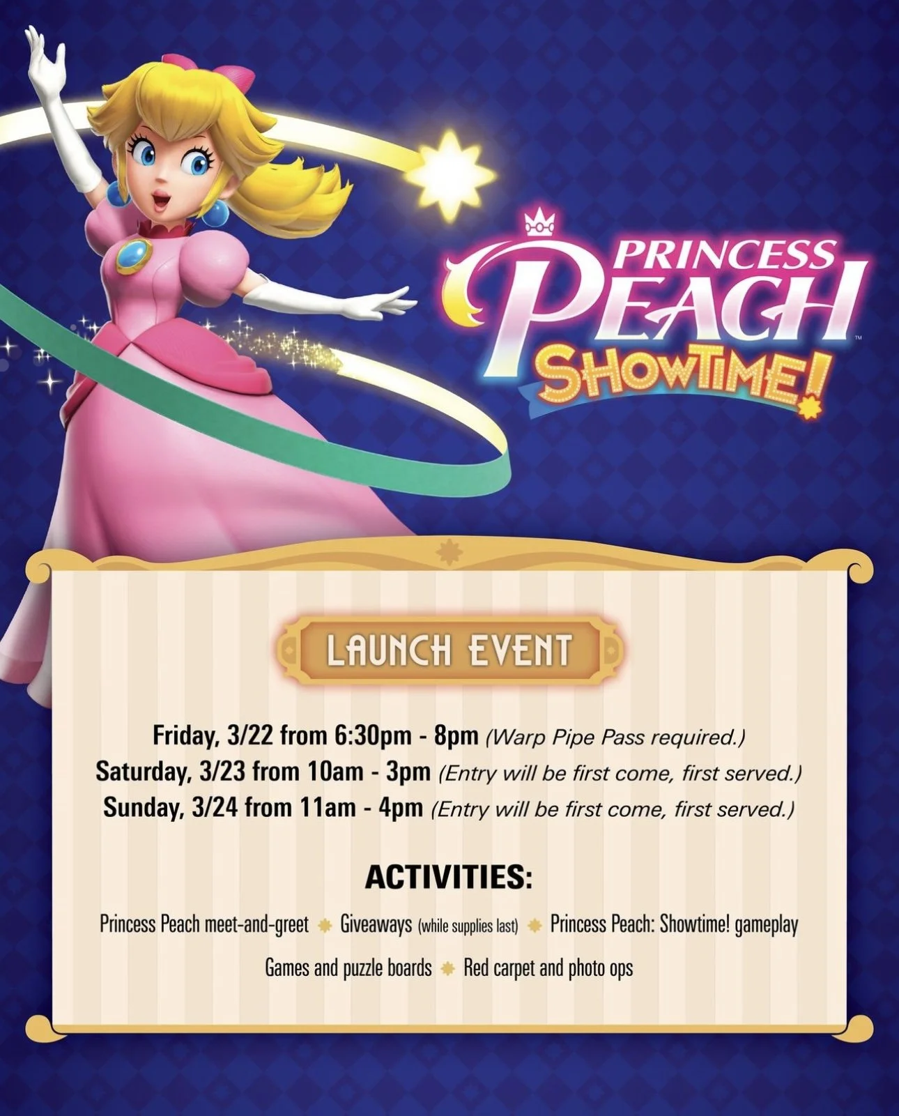 In NYC, the event is open to the public at Nintendo NYC on Saturday 3/23 and Sunday 3/24. Enjoy Princess Peach meet-and-greet, giveaways, gameplay, games and puzzleboards, and photo ops. Entrance is first come, first served.