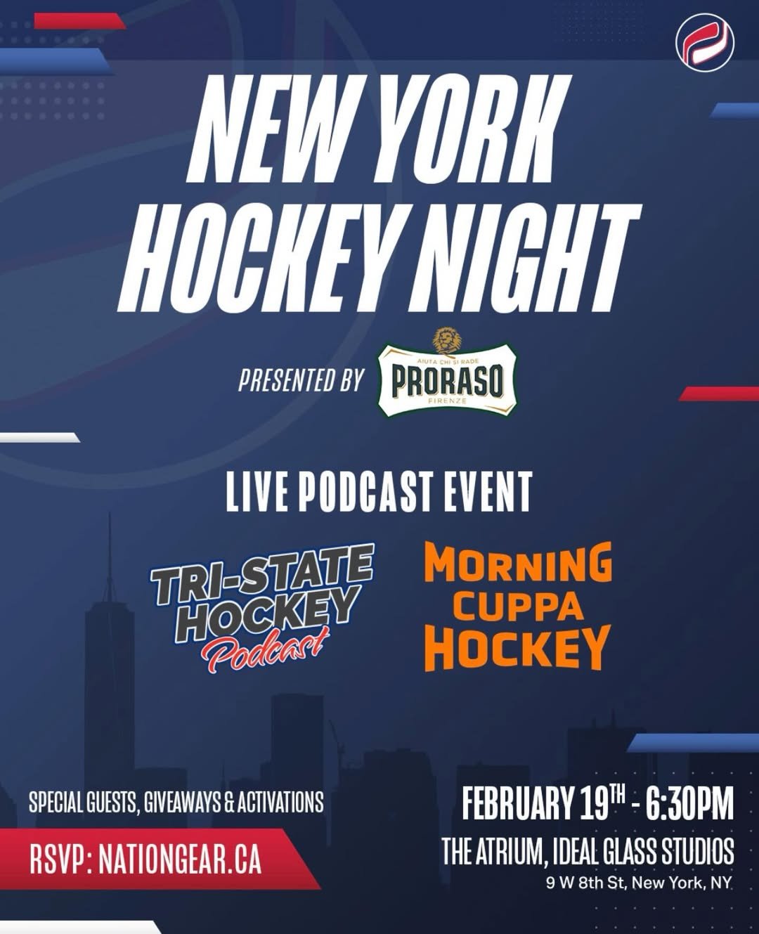 Free beer & pizza , live podcasts, gift bags, Proraso popup barbershop ๐, accuracy challenge, giveaways from Eataly & unapologetic hockey talk with Morning Cuppa Hockey + Tri-State Hockey Pod.