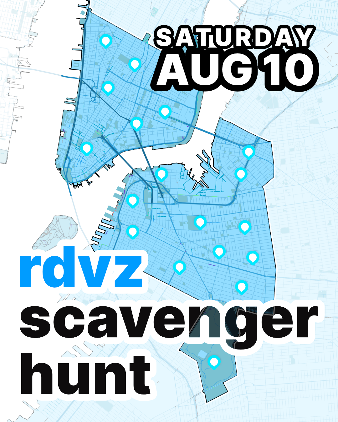 Join app rdvz for a scavenger hunt in Lower Manhattan & Brooklyn. Complete challenges that involve exploring the city and talking to new people, and win cash and other prizes.