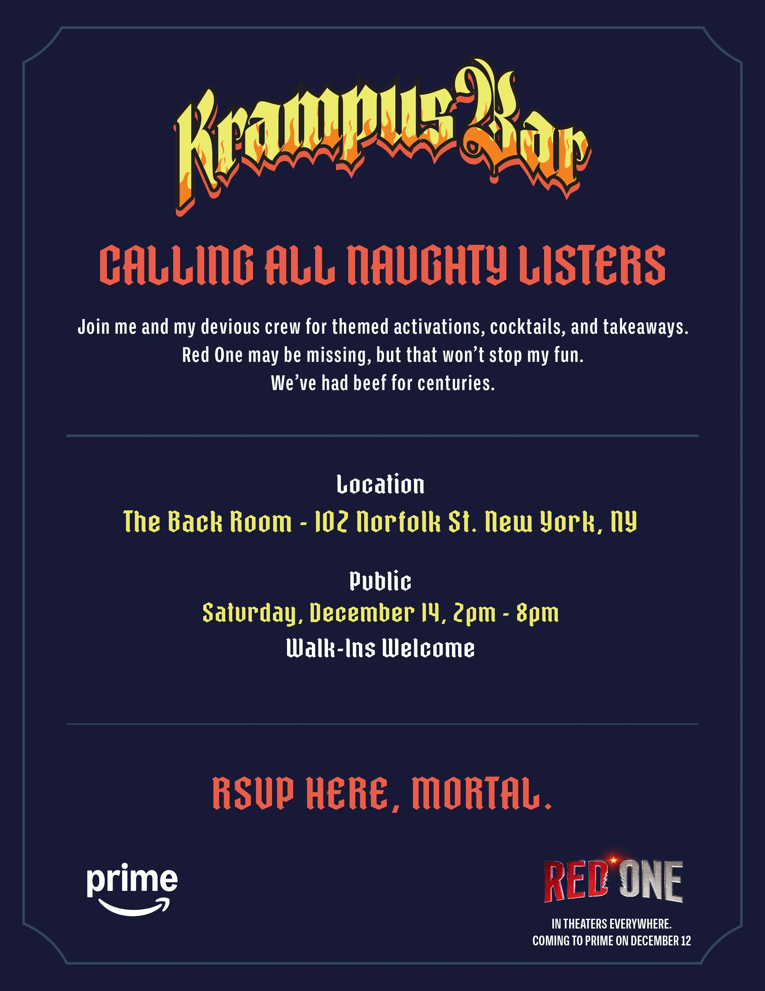 Calling all naughty listers! You’re invited to Krampus Bar for a wickedly fun night celebrating the darker side of the holiday season! On behalf of Amazon MGM Prime’s new film RED ONE, The Back Room is transforming into Krampus’s dark-sided lair.