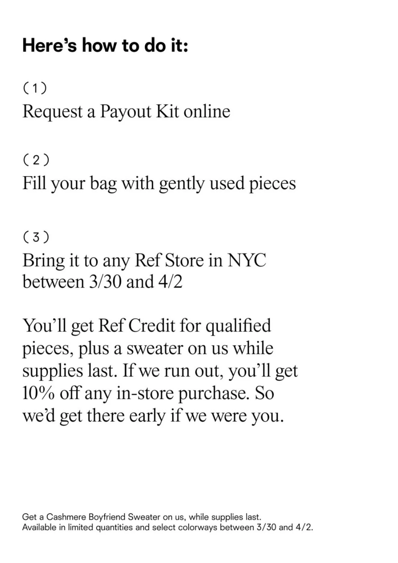 Never been a better time to clean out your closet. Do some spring cleaning by bringing your unwanted clothes to any NYC Ref store, and get a free Cashmere Boyfriend Sweater from Reformation and ThredUp.