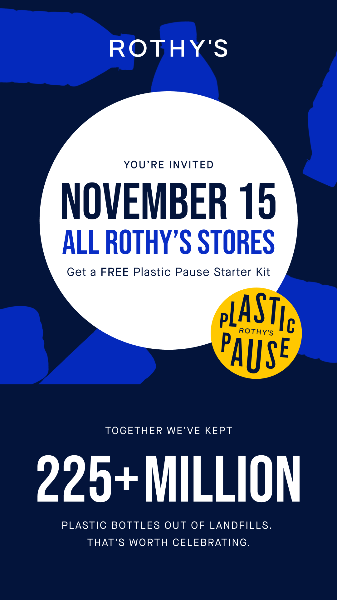 Bring a used plastic bottle to ANY Rothy’s store on 11/15. First 50 will score a FREE #PlasticPause Starter Kit—including a mesh tote and reusable bottle and straw.