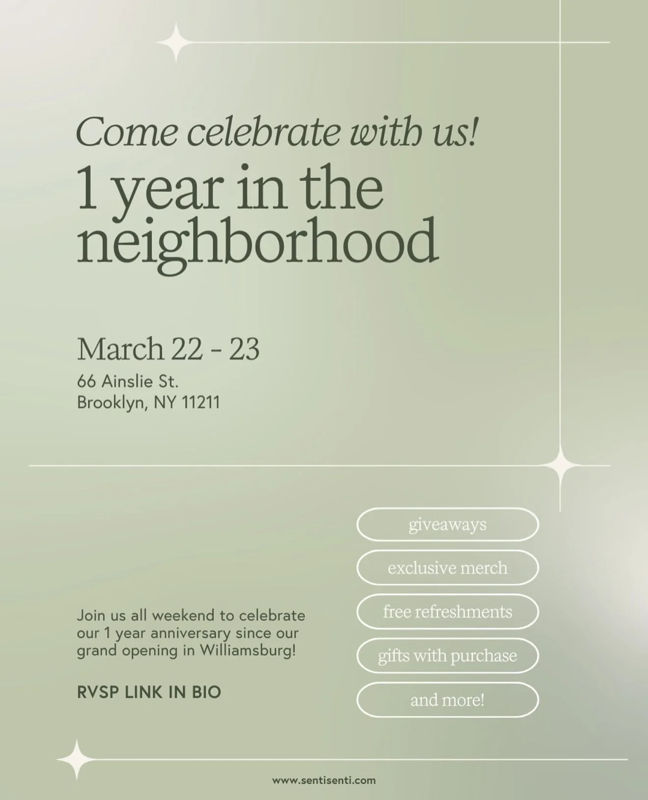 After 16 years in business and a successful year in Williamsburg, senti senti wants to celebrate with you and thank the community!