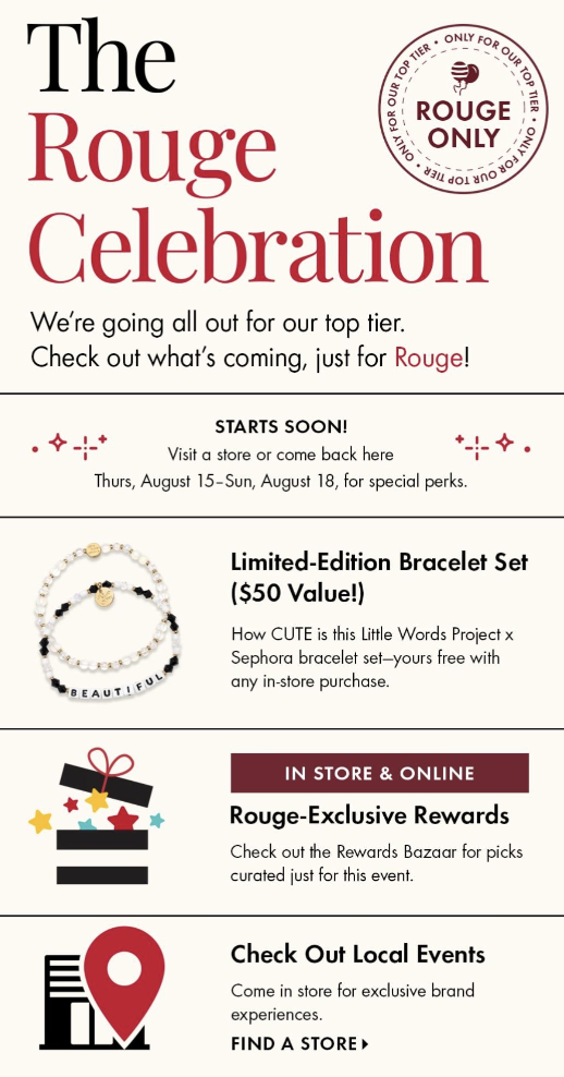 Sephora is hosting the first-ever Rouge Celebration, an event for Sephora’s most loyal shoppers of its Beauty Insider Program – Rouge-tier members, to enjoy special perks and experiences! The event is taking place from August 15th to 18th in Sephora stores and online, with exclusive brand activations happening at your local SOHO Sephora store!