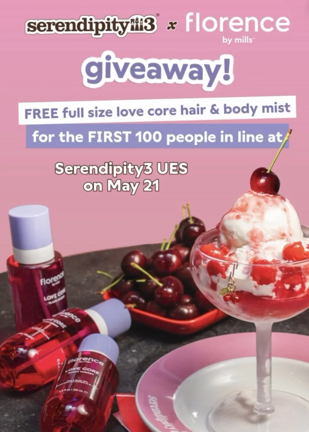 The first 100 guests in line May 21st at Serendipity3 Upper East Side will score a free full-size Florence by Mills Love Core hair & body mist ๐