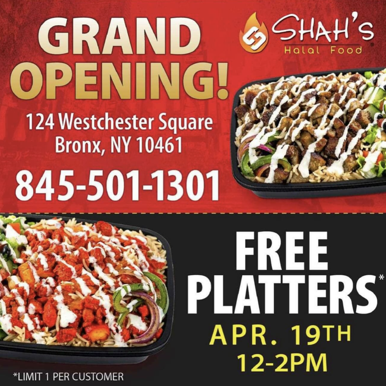 Shah’s Halal Food is opening this Saturday in the Bronx, and they’re giving out free platters to celebrate!