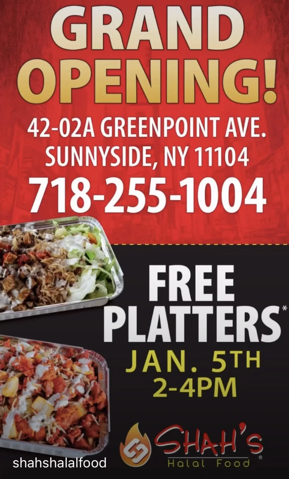 Shah’s Halal Food is opening this Friday in Sunnyside, Queens and giving out free platters to celebrate!