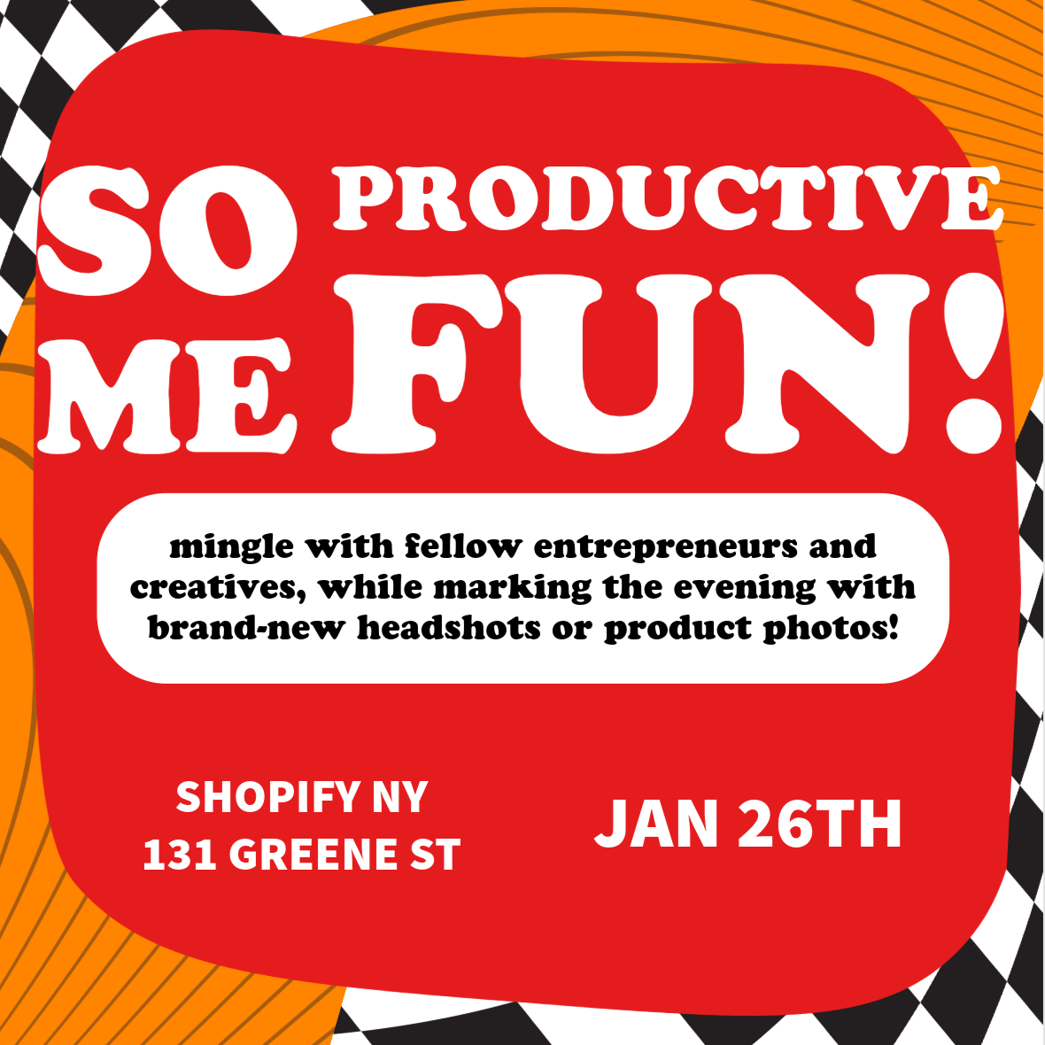 Step into 2024 with a fresh look at the Some Productive Fun event. It's the perfect spot to mingle with fellow entrepreneurs and creatives, while marking the evening with brand-new headshots or product photos! Hosted at Shopify NY, this happy hour event is the ideal escape for busy entrepreneurs and creatives from their regular routines.