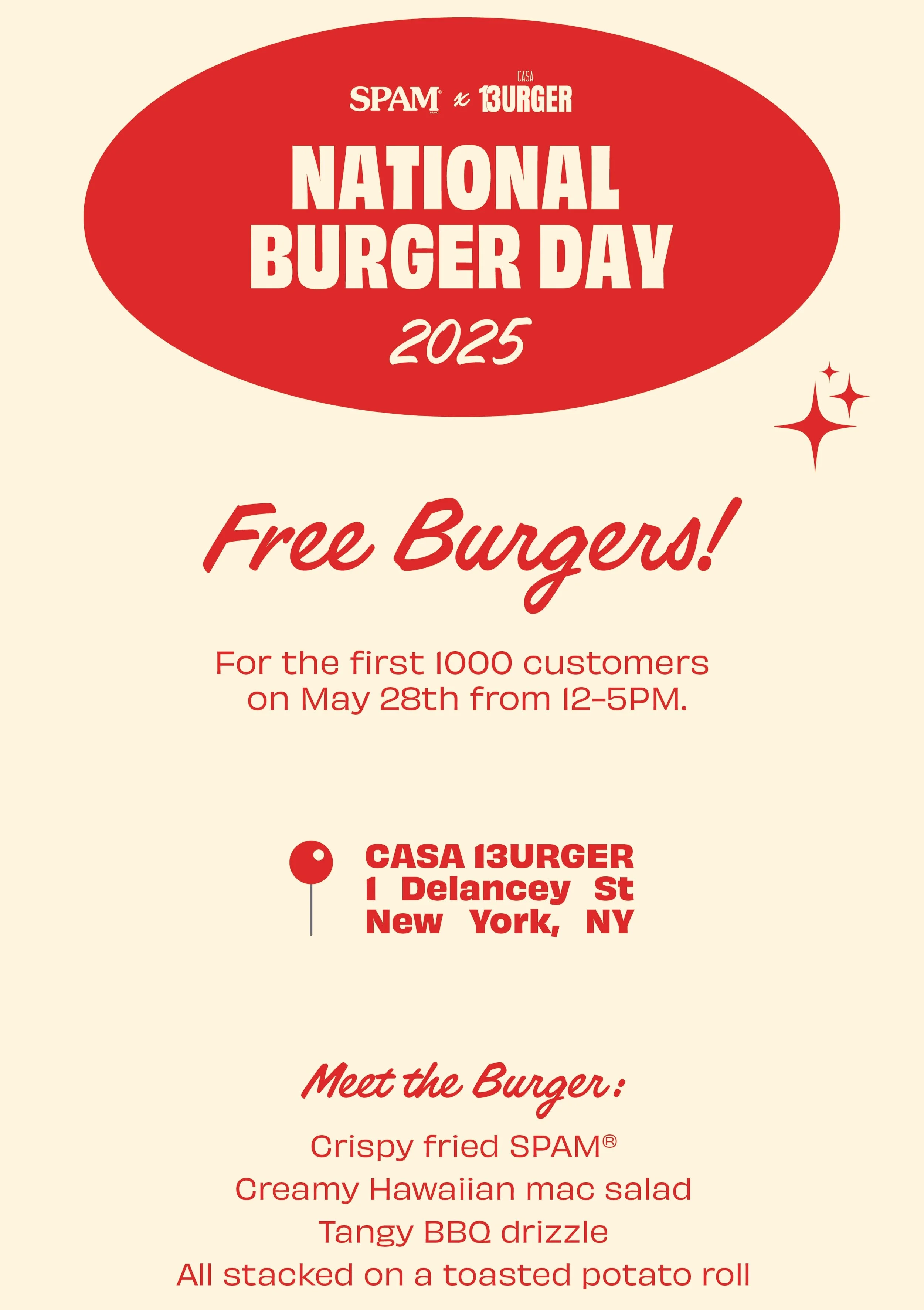 To celebrate National Burger Day (May 28), the iconic SPAM® brand is teaming up with viral NYC smashburger spot Casa 13urger for a one-day-only burger collab, and they’re giving away 1,000 SPAM® burgers for FREE on launch day.