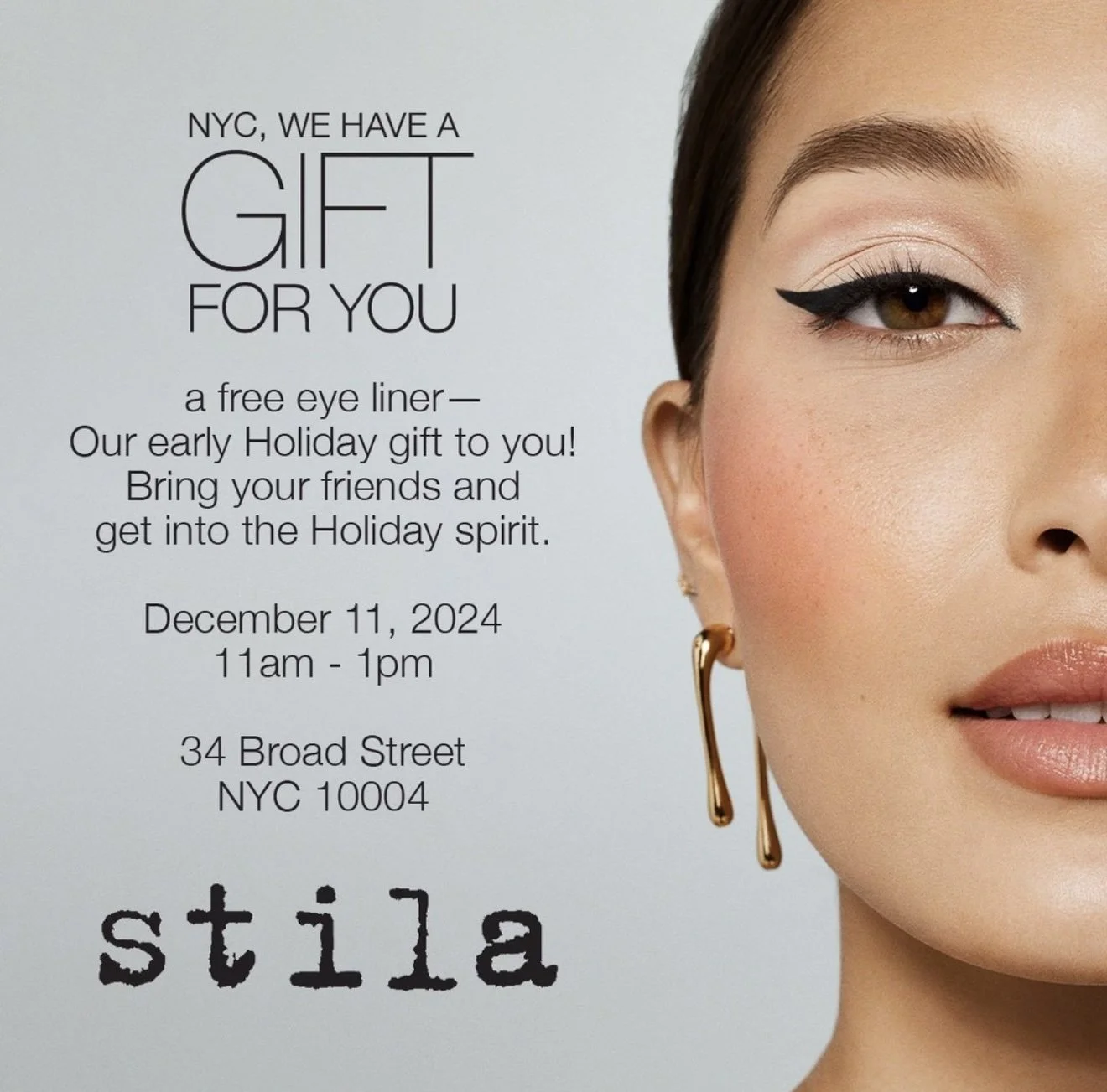NYC, Stila has a free holiday gift for you: a free eye liner! Bring your friends and get into the Holiday spirit.