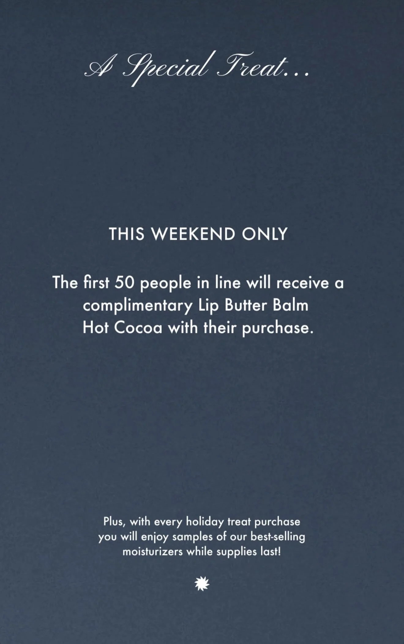 THIS WEEKEND ONLY: The first 50 people in line will receive a complimentary Lip Butter Balm Hot Cocoa with their purchase.