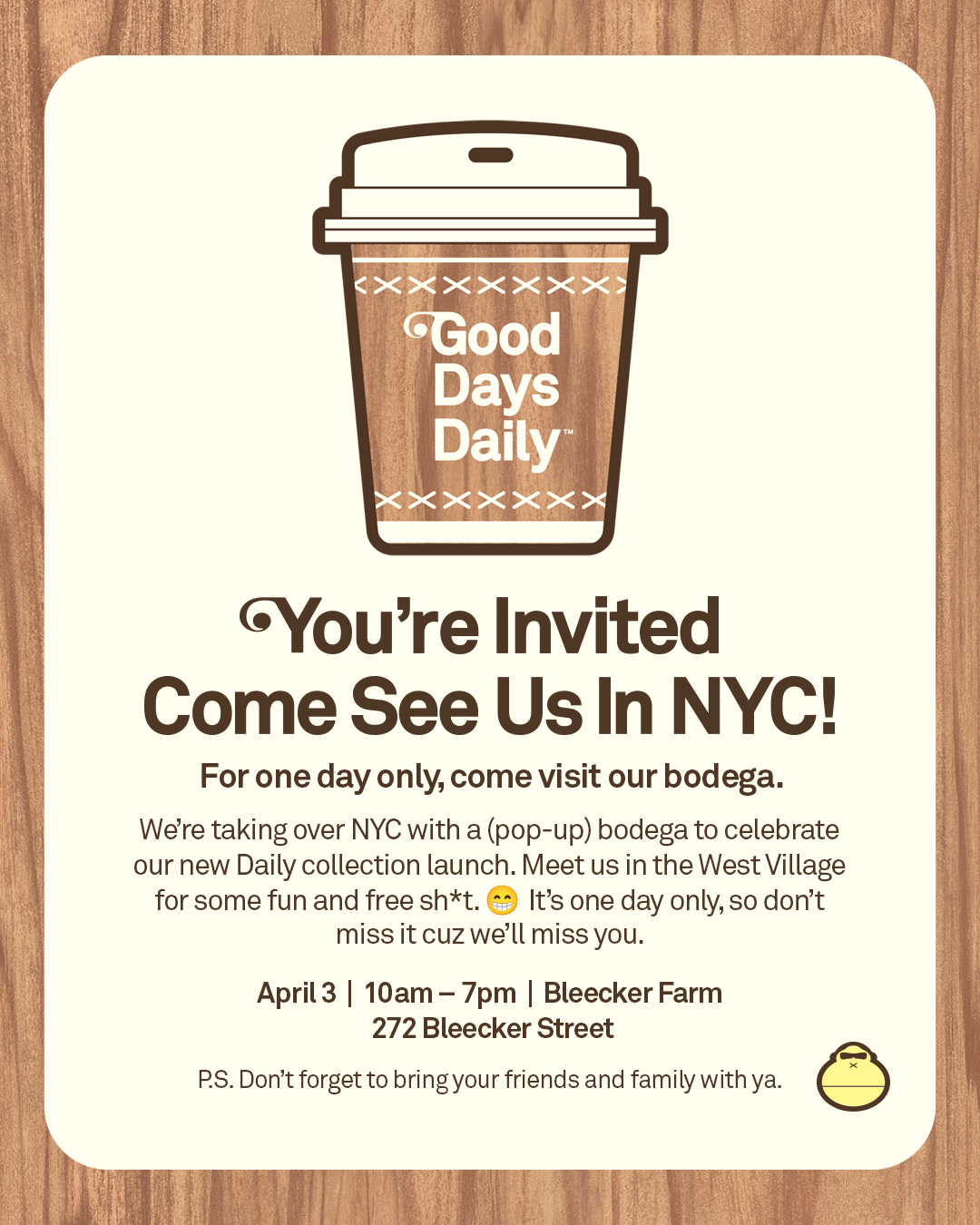 The Good Days Daily Bodega will be April 3rd from 10am - 7 pm at Bleecker Farm (272 Bleecker St).