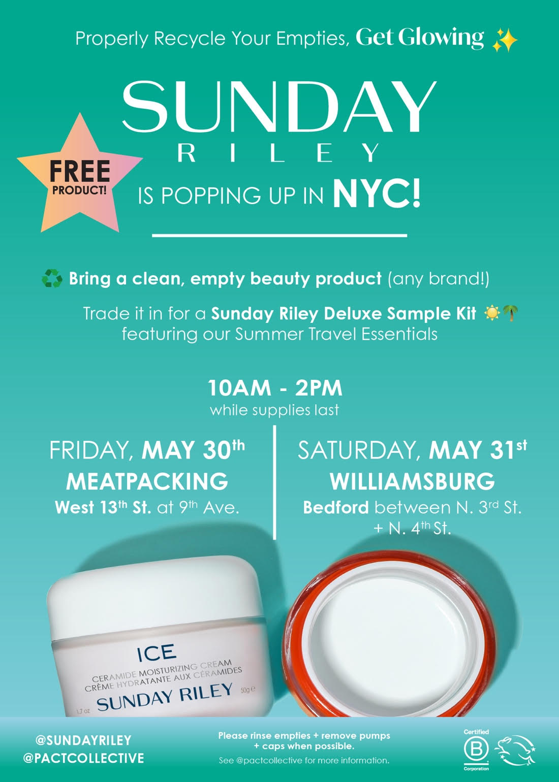 Sunday Riley invites you and your empties (from any brand) on May 30th + 31st in NYC to properly recycle and get glowing with a special trade off - you’ll receive a Sunday Riley Deluxe Sample Kit inclusive of all your summer travel essentials! This is just one portion of the many sustainable initiatives the brand is a part of.