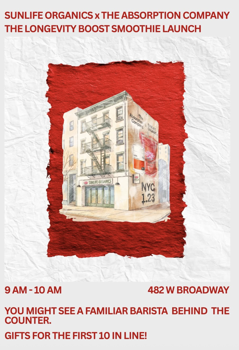To celebrate The Absorption Company’s new line of foundational supplements, they are launching a NYC exclusive collaboration at SunLife: The Longevity Boost smoothie! A rich, red velvet inspired, protein packed smoothie with CoQ10 capsules designed to be 10x more absorbable.