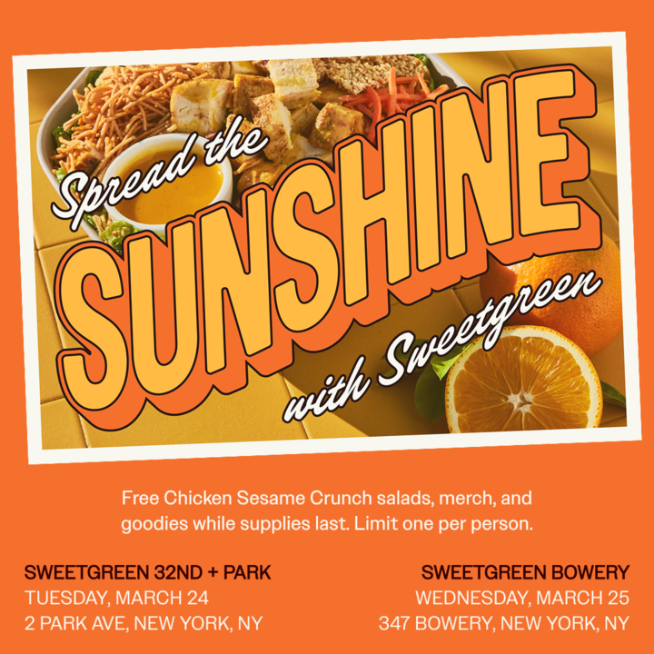 To celebrate, Sweetgreen is kicking off its “Spread the Sunshine” campaign, with two NYC activations transforming select locations into citrus-inspired spaces featuring playful visuals, sunny photo moments, and exclusive merch inspired by the salad’s citrus flavors. On the day of each takeover, guests can also enjoy a free Chicken Sesame Crunch salad.