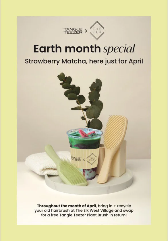 Throughout April, bring in + recycle your old hairbrush at The Elk (*West Village location only) and swap for a free Tangle Teezer Plant Brush! Plus, enjoy a special collab Strawberry Matcha.