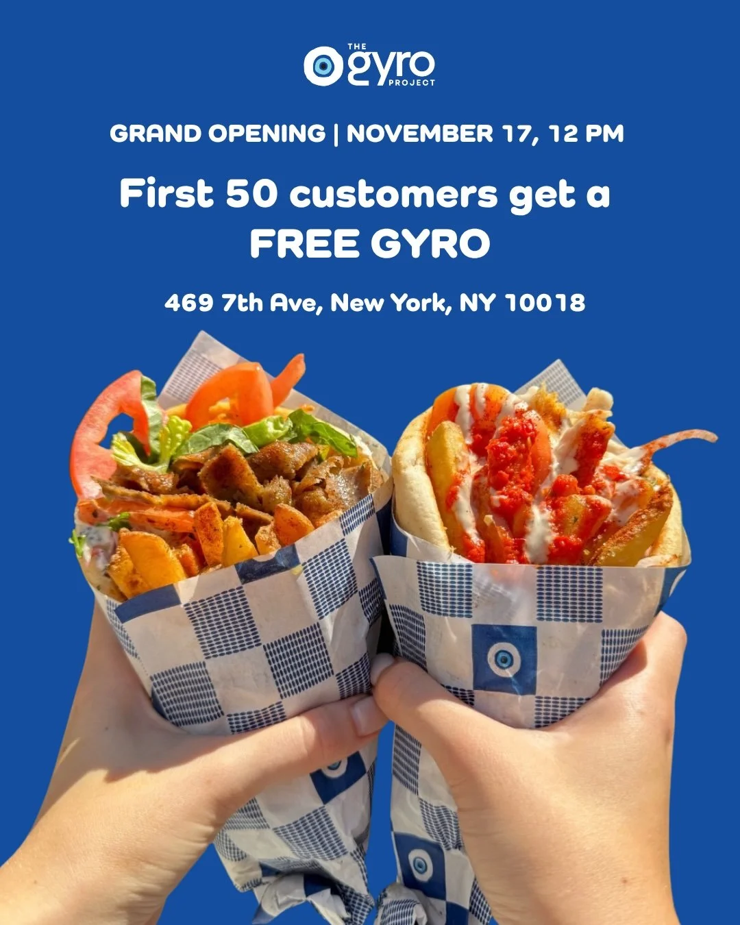 The Gyro Project is opening a new Manhattan location in Midtown South at 469 7th Ave and giving away 50 free gyros!