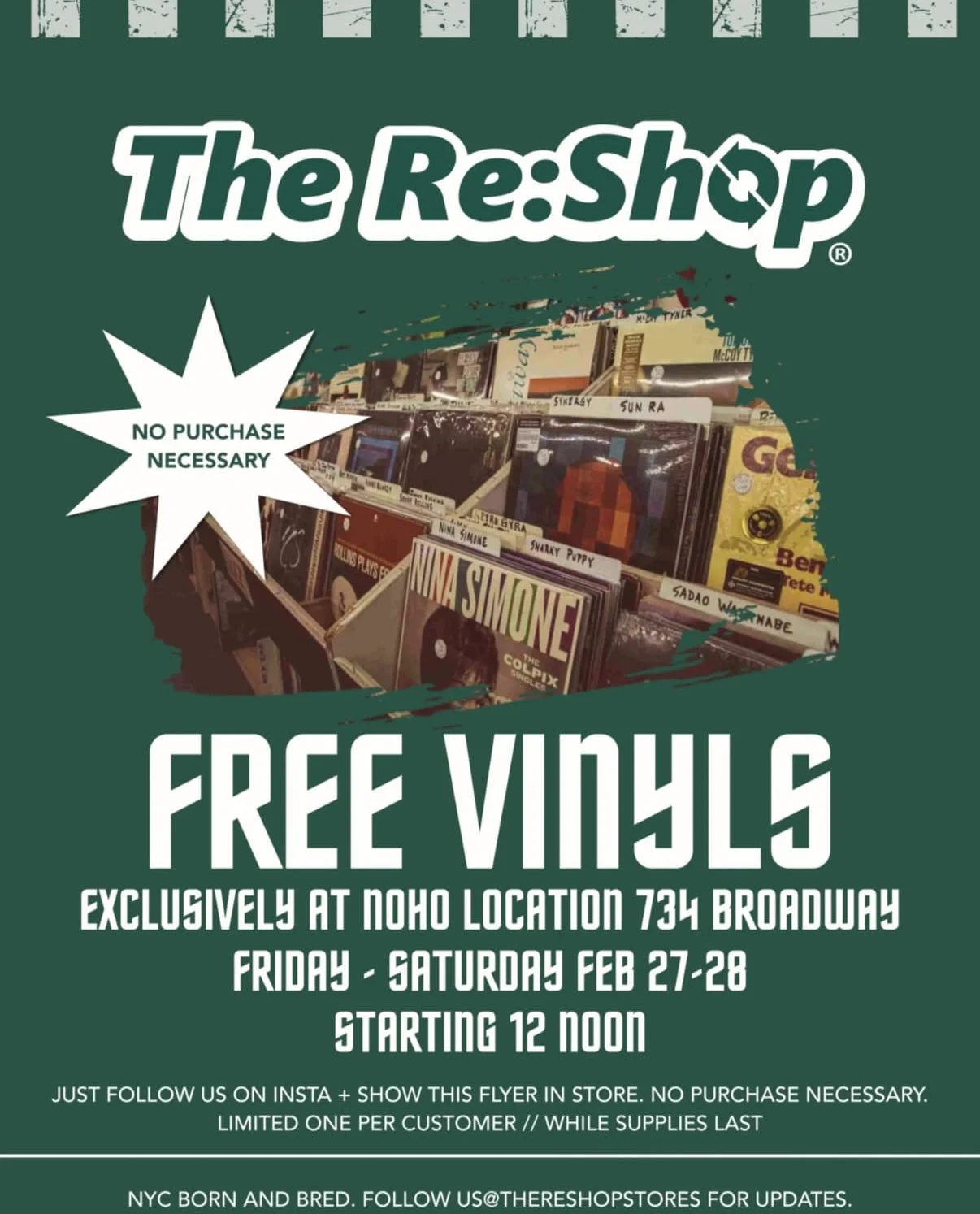 This Friday–Saturday (Feb 27–28) starting at 12PM, they’re doing a FREE vinyl giveaway at the Reshop NoHo store! One vinyl per person!