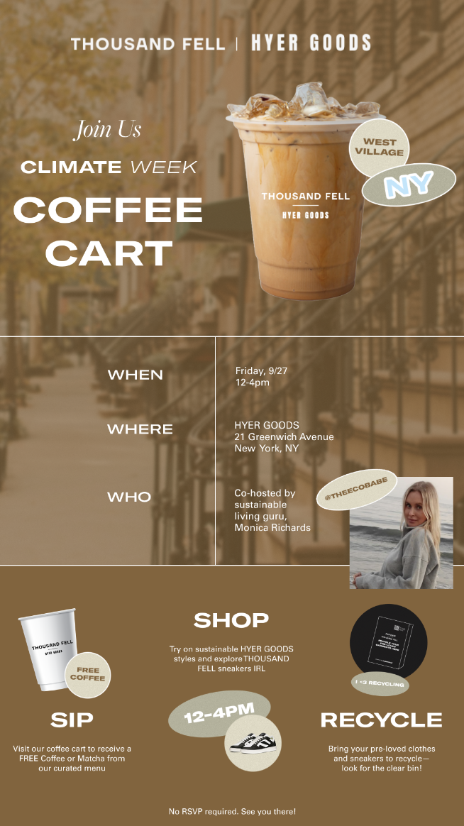 You’re invited to sip, shop, and recycle at the @thousand_fell x @hyergoods Climate Week Coffee Cart co-hosted by @theecobabe FRIDAY (9/27) from 12pm-4pm!