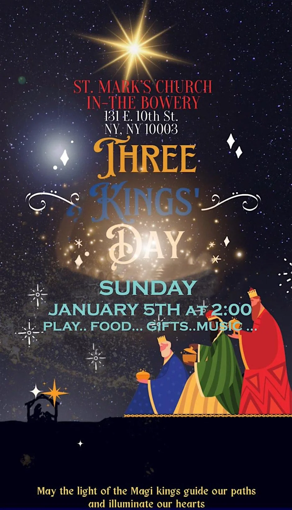 Come join us for a festive Three Kings Day Play and Celebration at St. Mark's Church in-the-Bowery on East 10th Street in New York, NY, USA. Let's celebrate this special day together with a play, music, and and fun for all ages. Children who attend will receive a small gift. See you there!