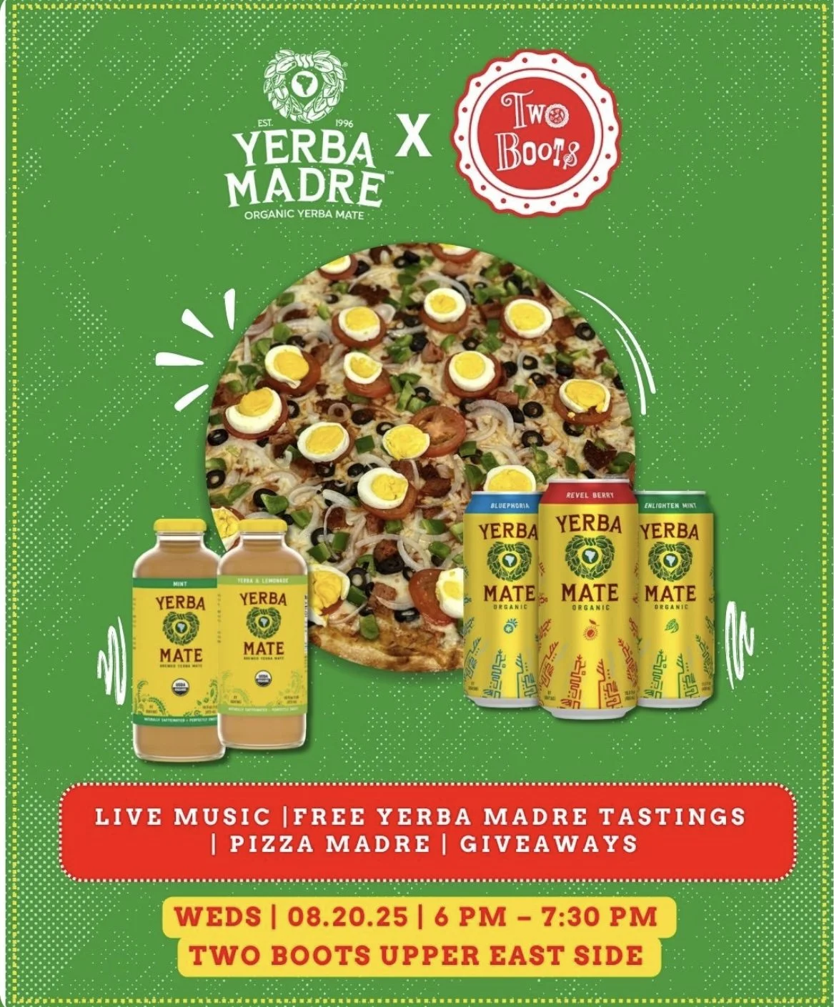 Celebrate the rebranding of Yerba Madre with live music, FREE tasting of their new summery flavors, an exclusive one-night-only pie (Pizza Madre FTW), and some very tasty giveaways & swag. Get ready to spin for luck with some serious yerb-energy. SEE YOU SOON! 👏 🗓Wednesday, Aug 20 | 6 – 7.30 PM 📍Two Boots Upper East Side