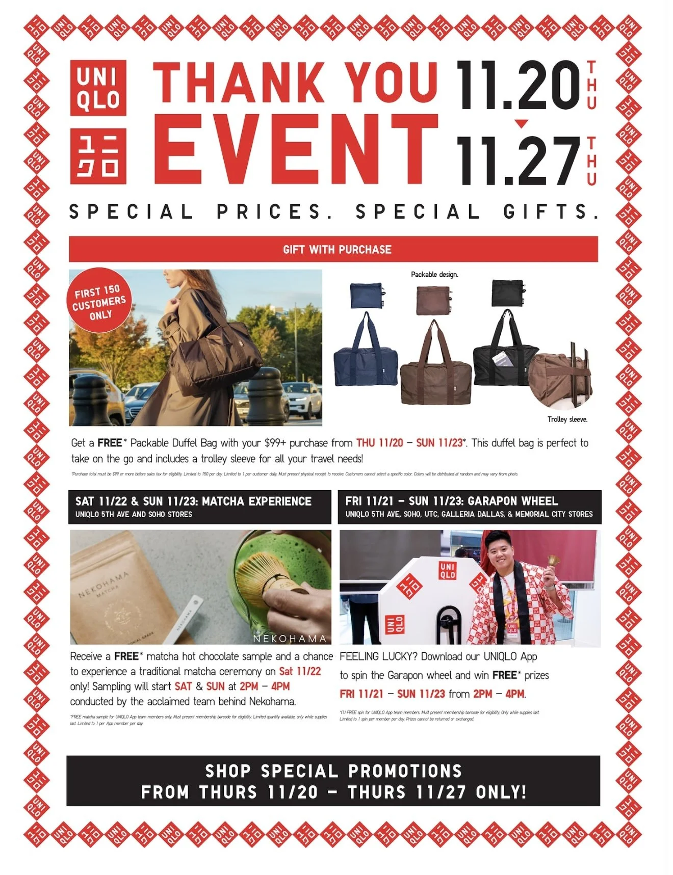 Fri 11/21 - Sun 11/23: GARAPON WHEEL: FEELING LUCKY? Download our UNIQLO App to spin the Garapon wheel and win FREE* prizes FRI 11/21 - SUN 11/23 from 2PM - 4PM.