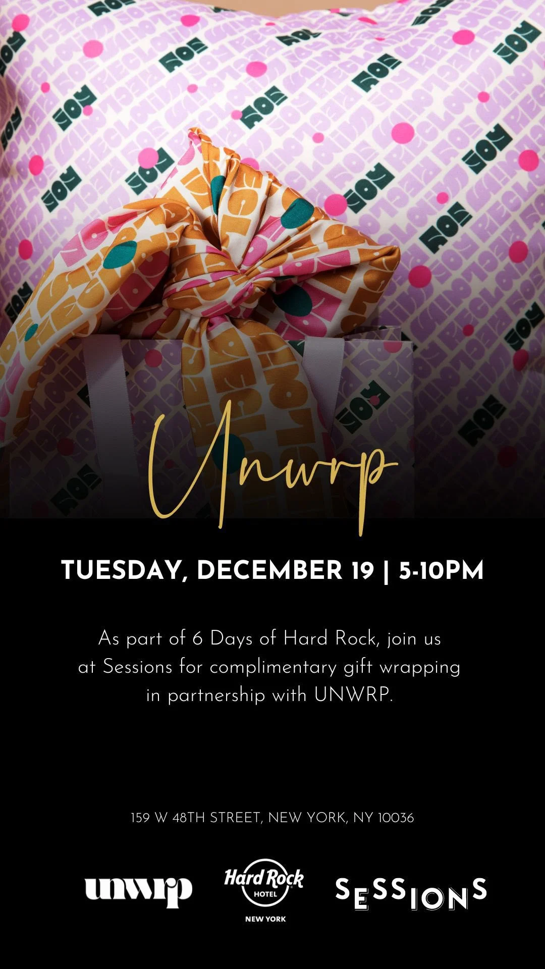 Hard Rock Hotel New York has partnered with UNWRP to bring complimentary gift wrapping to Sessions on Tuesday, December 19th from 5 PM - 10 PM.