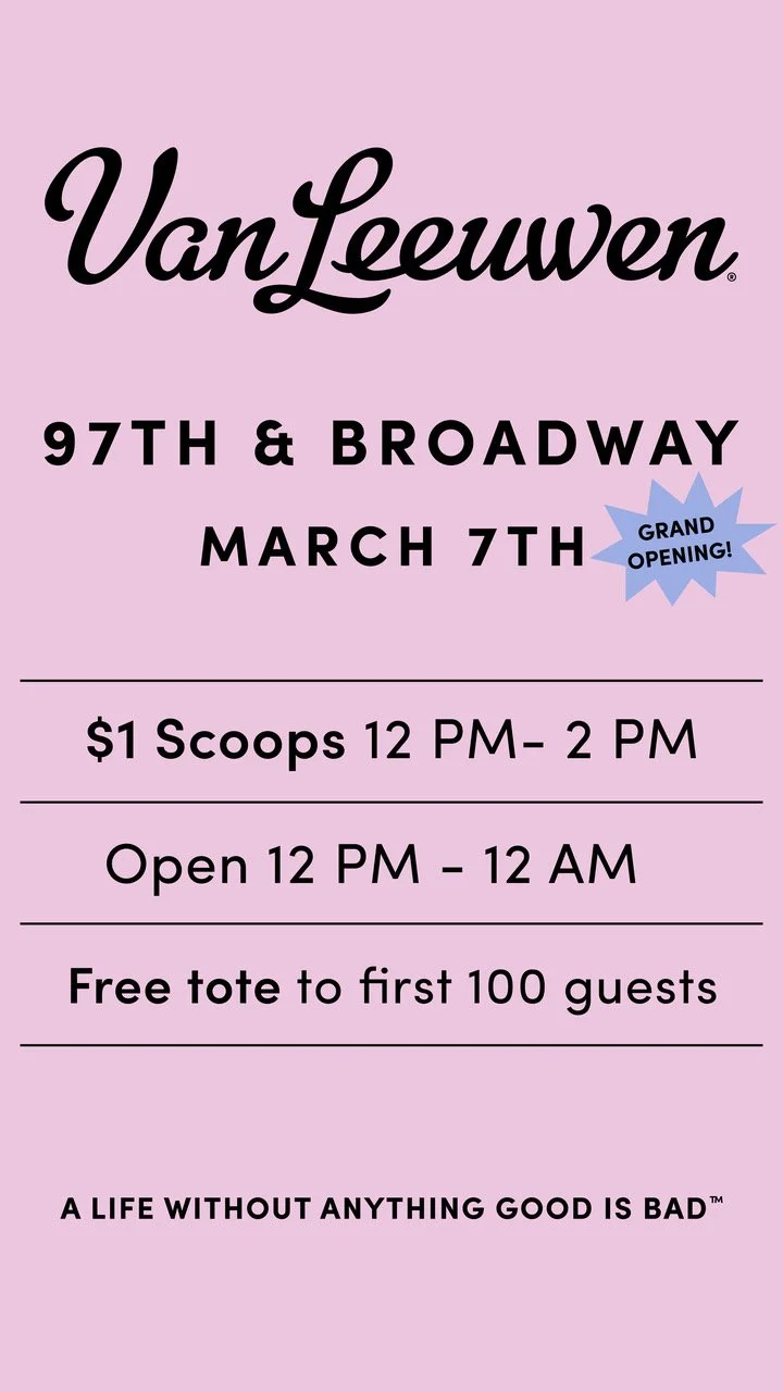 Van Leeuwen is opening its newest scoop shop in NYC on Thursday, 3/7 on 97th & Broadway! Here’s the scoop on opening day details: