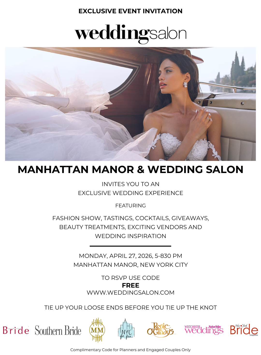 Join Wedding Salon for an exclusive event at Manhattan Manor in New York City, where engaged couples and planners can discover the latest trends in cakes, flowers, honeymoons and so much more. There will be top wedding vendors, tastings, cocktails, spa services, fashion show, live entertainment, makeovers, exciting raffles and so much more. Partners include NYC for Free, Southern Bride, New York Bride, Manhattan Bride, NJWedding and Westchester Weddings.