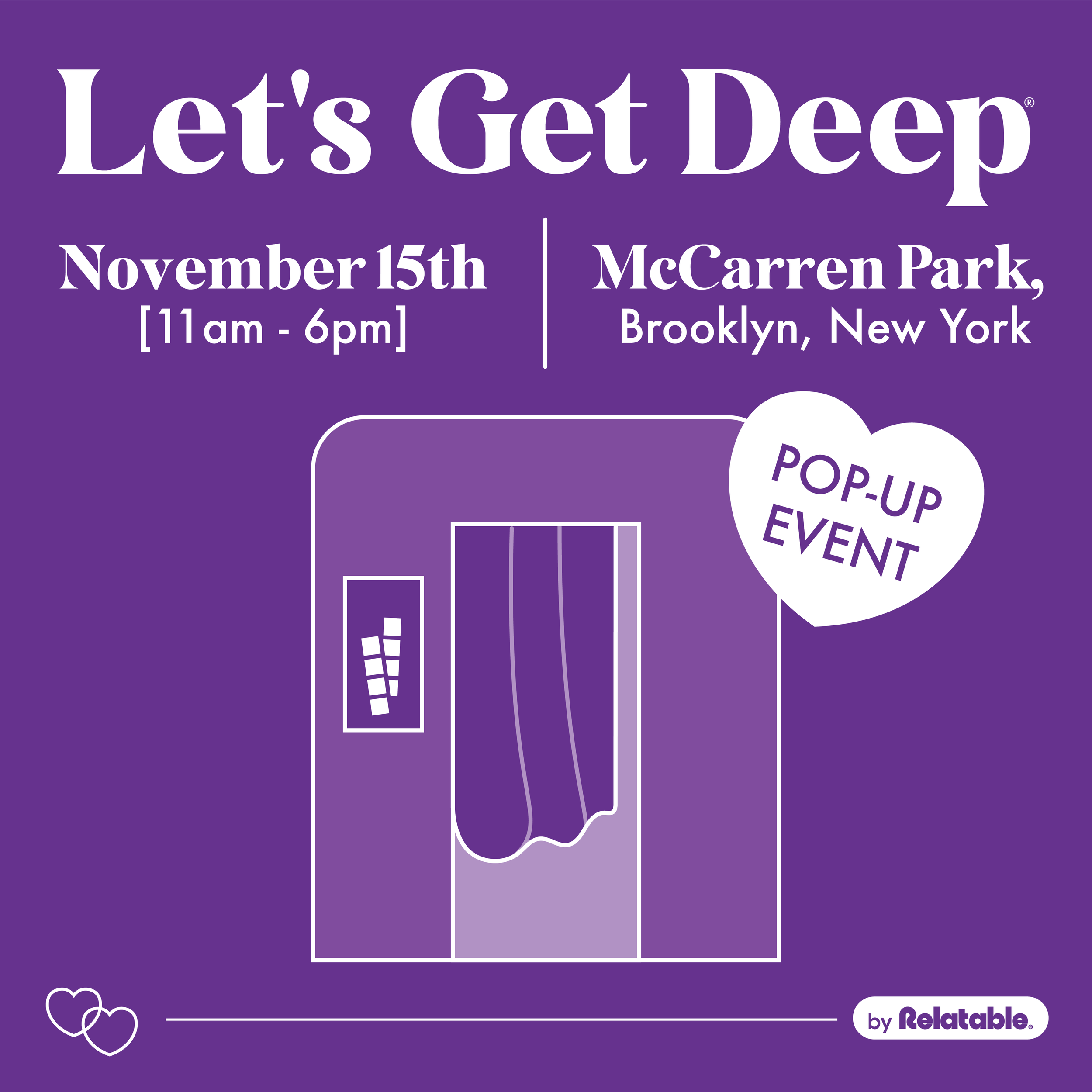 WHEN: November 15th 11am - 6pm. WHERE: McCarren Park, Brooklyn WHAT: A FREE photo booth experience where you and a friend or romantic partner can get your pic taken and answer questions from our best-selling relationship card game, Let’s Get Deep! Get your nostalgic photo strip, a video of your answers, and some other fun merch, too. *While supplies last