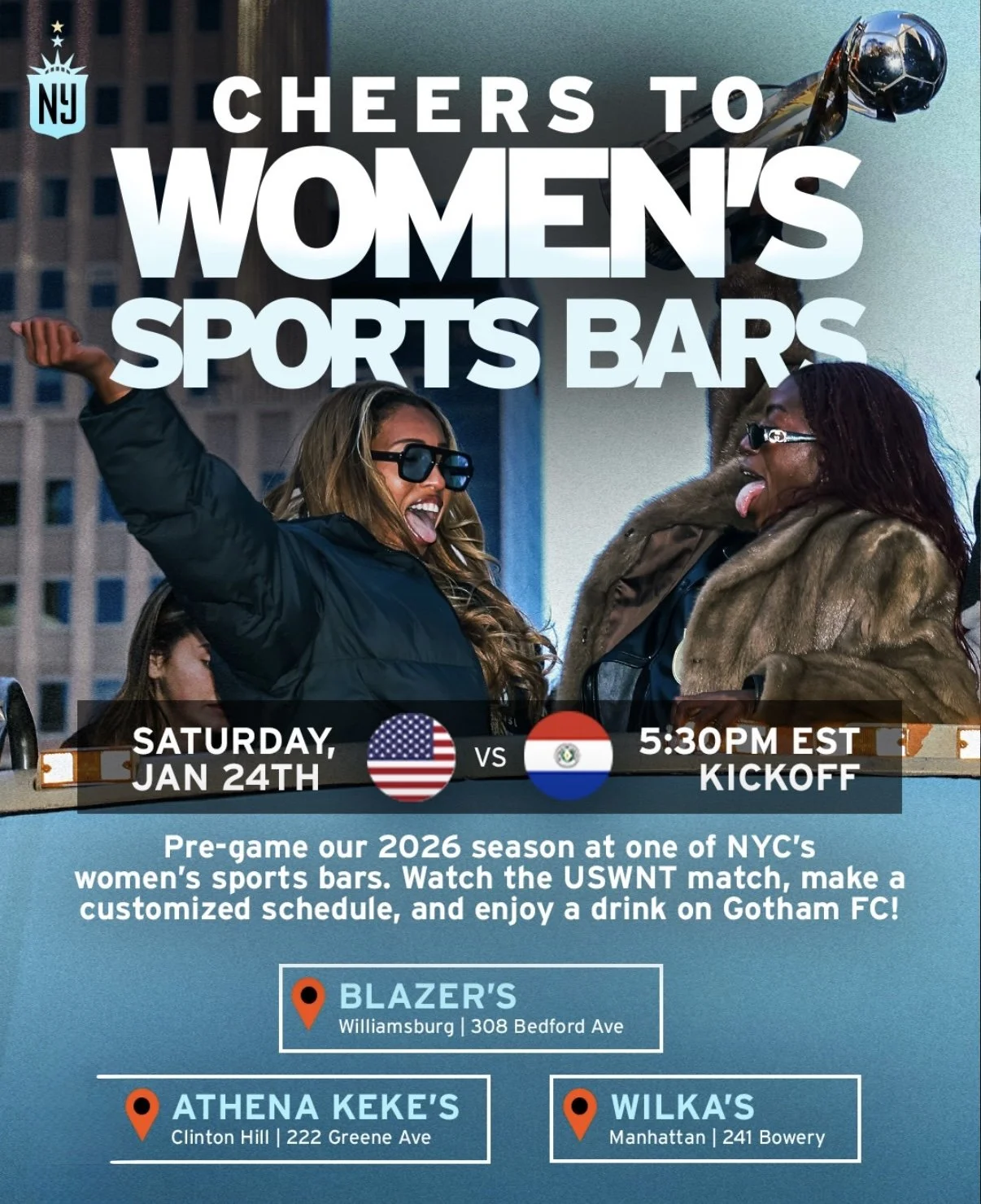 Head over to our friends at @blazerssportsbar, @athenakekesnyc, or @wilkasnyc for the @uswnt match on 1/24 🇺🇸⭐️